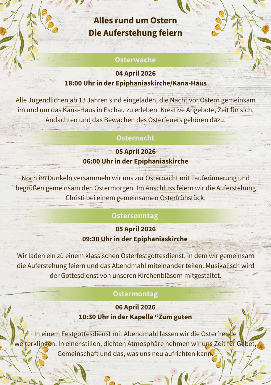 Immer mittwochs um 19.00 Uhr feiern wir ein offenes Abendgebet in der Epiphaniaskirche. Es erwarten Sie unterschiedliche Besinnungen zum Nachdenken, zur Ruhe kommen und den Abend zurück in Gottes Hand legen. Die Andachtsreihe startet am 25. Februar 2026.